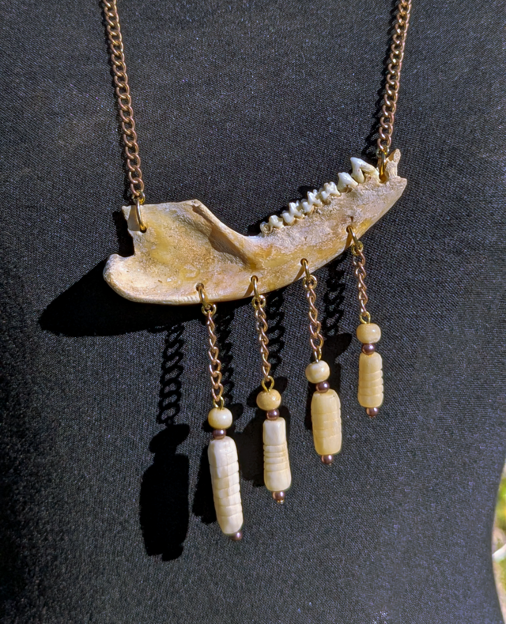 This necklace is built around the jawbone of a small unknown animal. Featuring vintage ivory beads and rose gold accents.