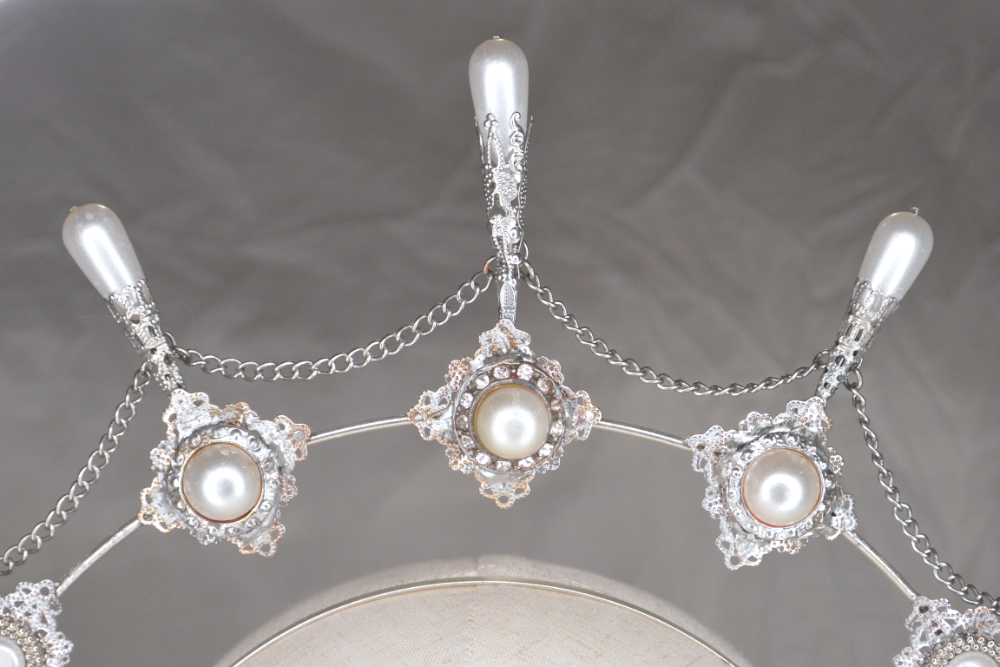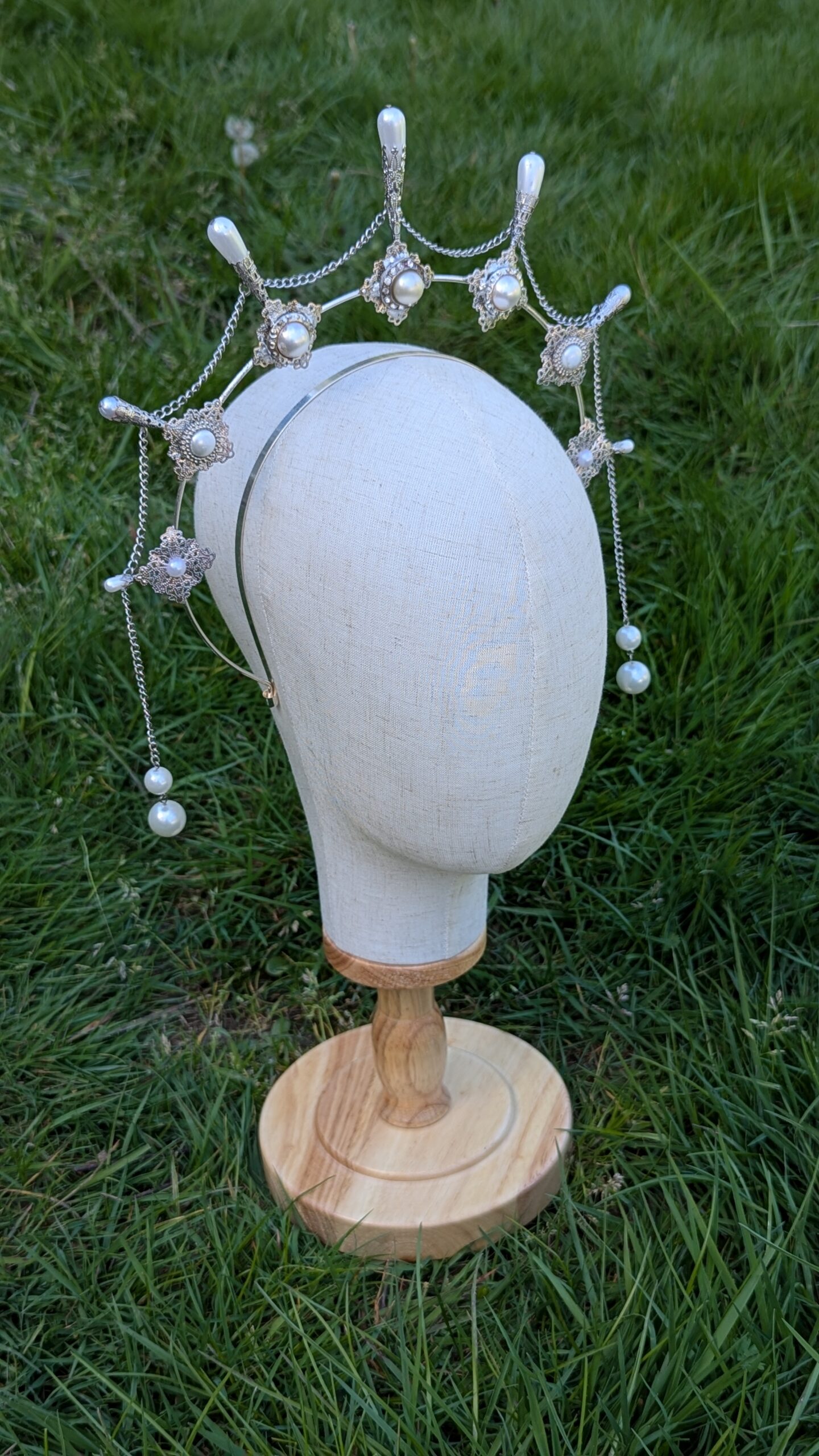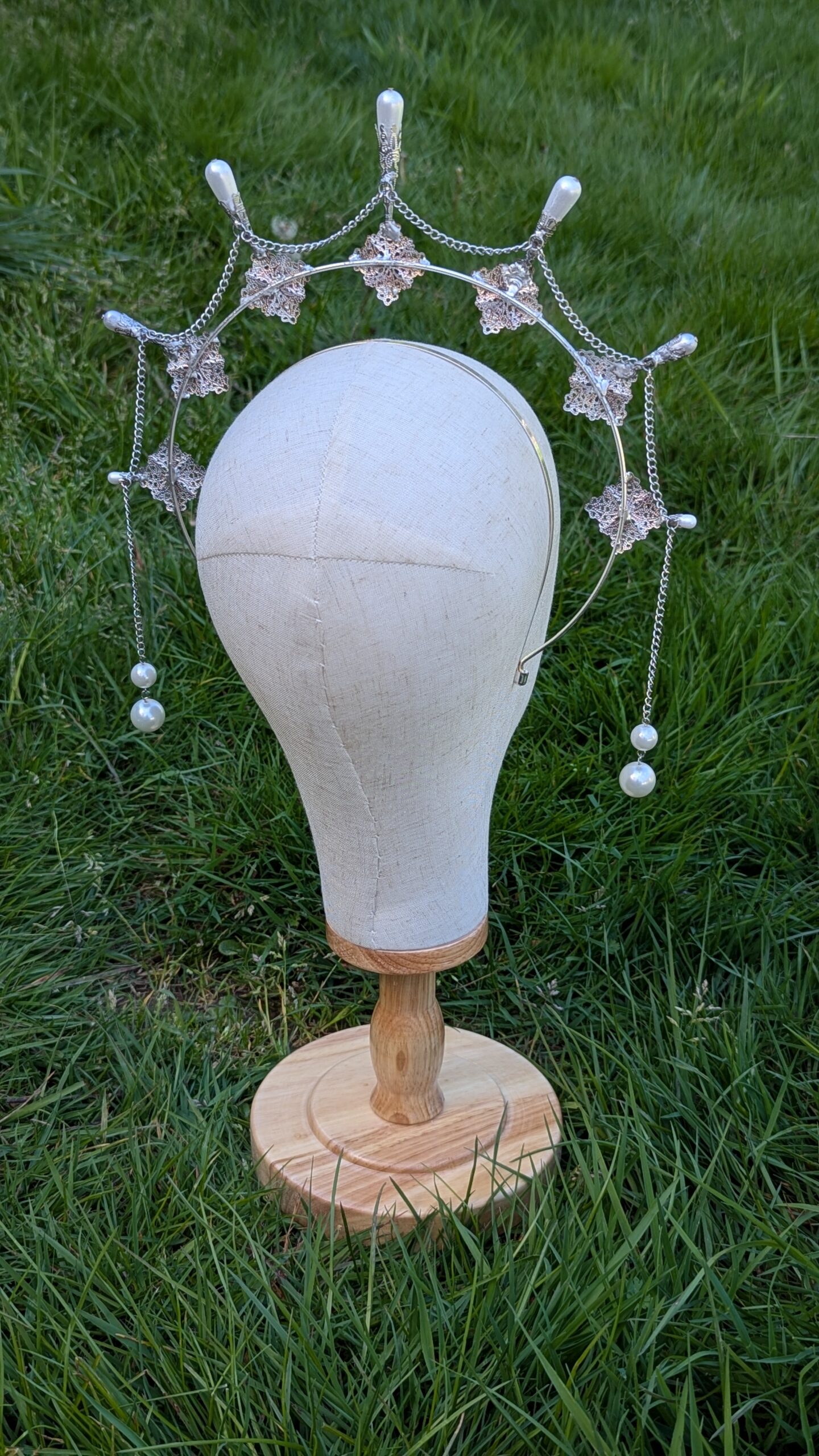 This silver halo-style headband is adorned with delicate filigree, faux pearl drops, and repurposed vintage buttons. One size fits all, one-of-a-kind.