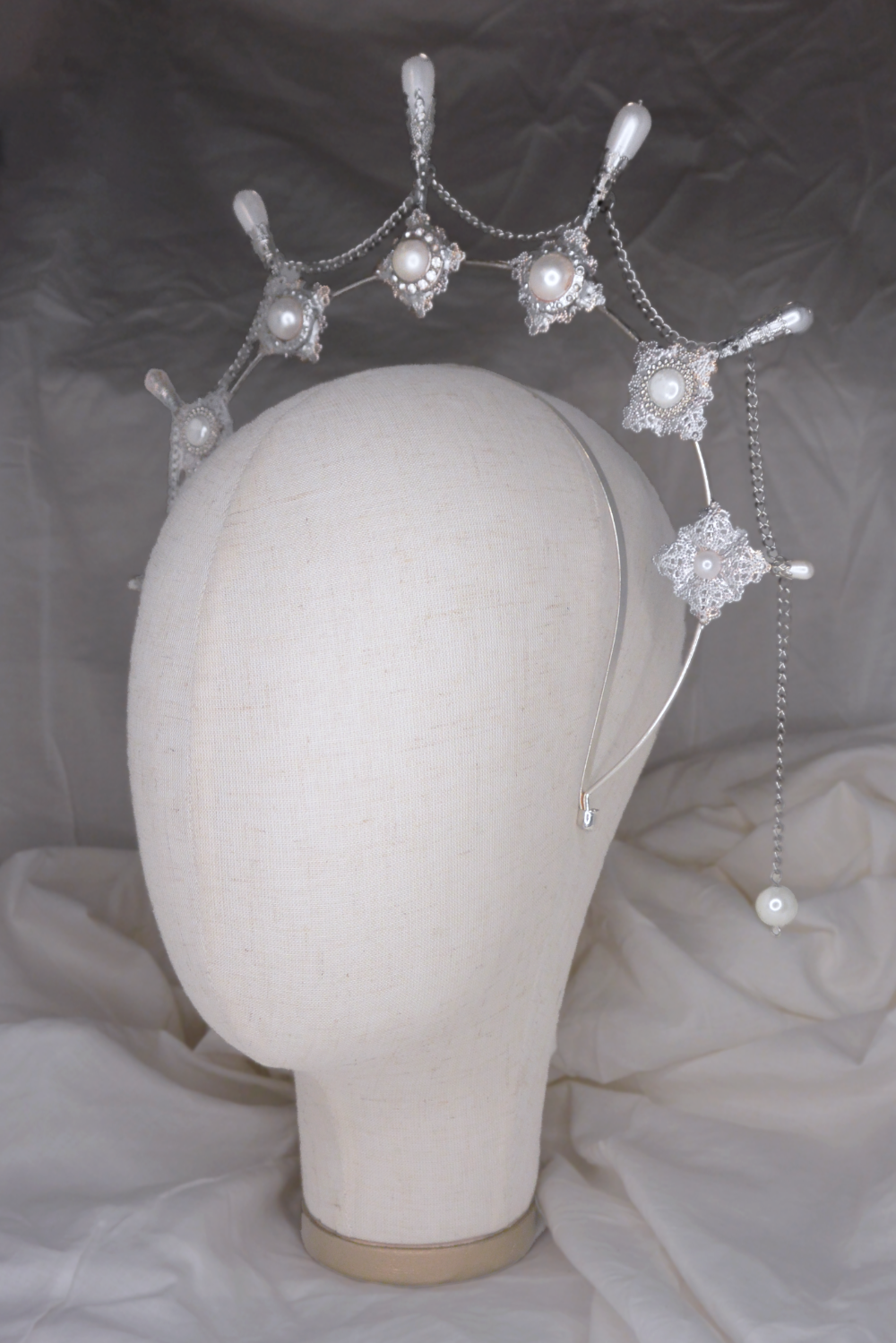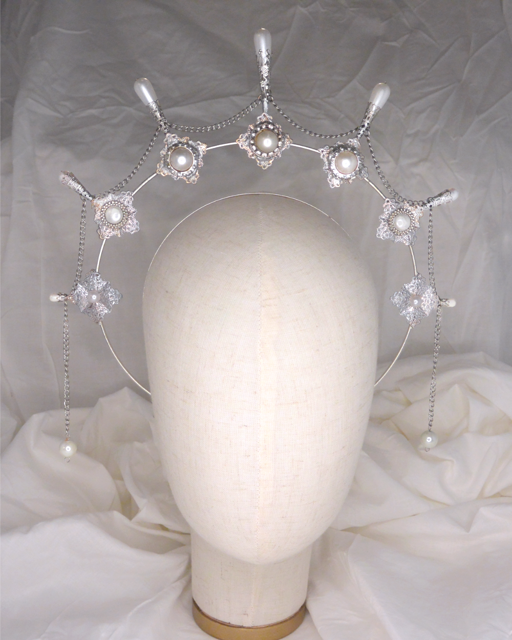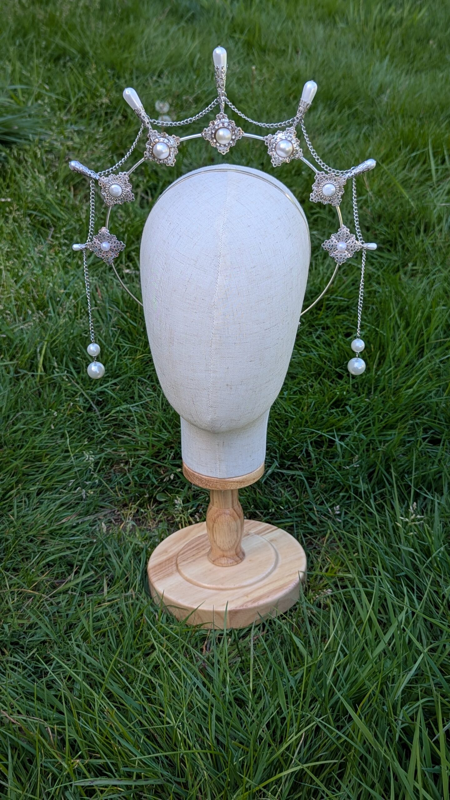 This silver halo-style headband is adorned with delicate filigree, faux pearl drops, and repurposed vintage buttons. One size fits all, one-of-a-kind.